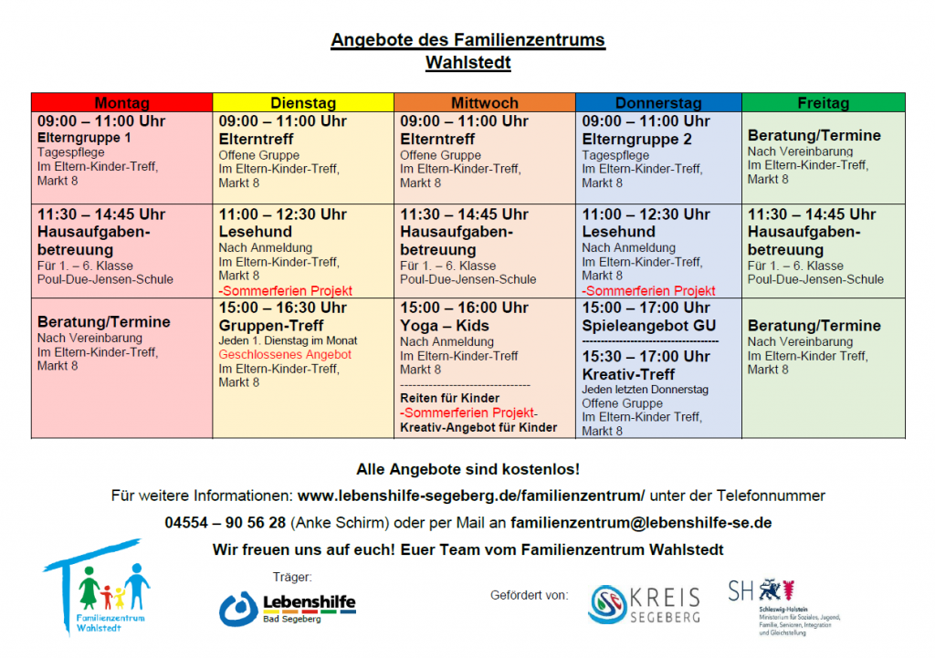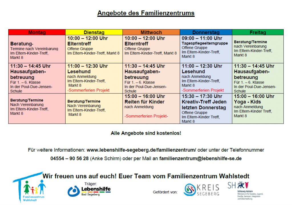 Das Familienzentrum ist eine Anlaufstelle für alle Eltern in Wahlstedt und Umgebung. Die Aufgaben des Familienzentrums sind die Vermittlung von Angeboten für Eltern und Kinder, Elternbildung, Begleitung, Unterstützung und Beratung der Familien.